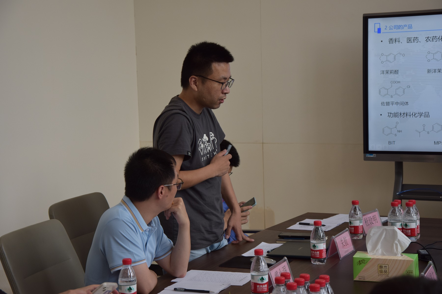硫磷研究院副院長戴小強帶領新員工熟悉工作環境,邊走邊介紹實驗室分布及各個項目的發展情況。