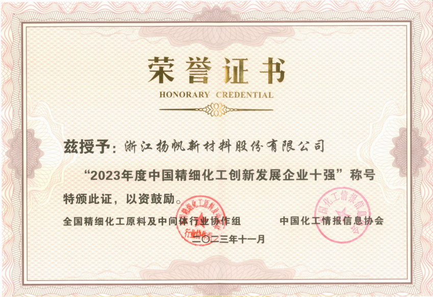 2023年度中國精細化工創新發展企業十強證書