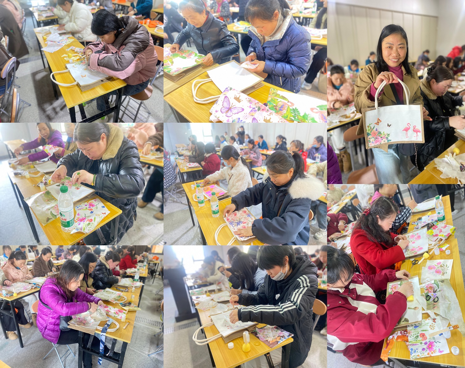 老師為大家介紹了蝶古巴特包的創作技巧,帶領大家一步步制作,從挑選復古印花紙、裁剪圖案,到使用專用膠水構圖拼貼,最后利用清漆封層,無不細致講解。隨后,大家紛紛動手,積極參與,互相幫助,現場氣氛熱烈。原本素凈的帆布包逐漸被絢麗的拼貼圖案覆蓋,成為承載公司溫情的藝術載體。
